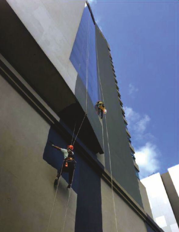 Restauración completa de la fachada, trabajos en pintura, albañilería, sellado, refuerzos estructurales, cambio de aberturas, cambio de termopaneles en curtain wall ,apertura de nuevos vanos para generación de nuevos espacios , cerramientos interiores en blindex , trabajos en alturas con 8 balancines en simultáneos mas de 20 operarios de la empresa.
