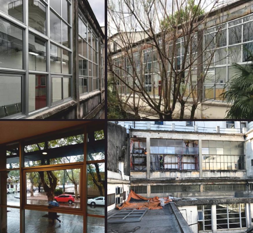 Retiro y colocación de más de 1000 m2 de cerramientos de hierro por aberturas de aluminio en diferentes prestaciones, reconstrucción de mochetas y terminaciones varias.